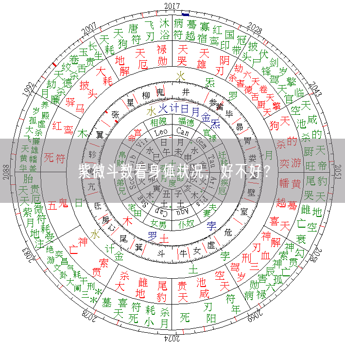 紫微斗数看身体怎么样,要重点看煞星的宫位,尤其是擎羊、天刑、天月、天虚的位置。一个人命盘午宫煞星化忌云集,那这人最易得头部、眼睛、心脑血管层面的病症。再例如一个人丑宫破的很厉害,那么他的肝脏、情志层面最易出现病症。紫微斗数看身体是不是太过劳碌